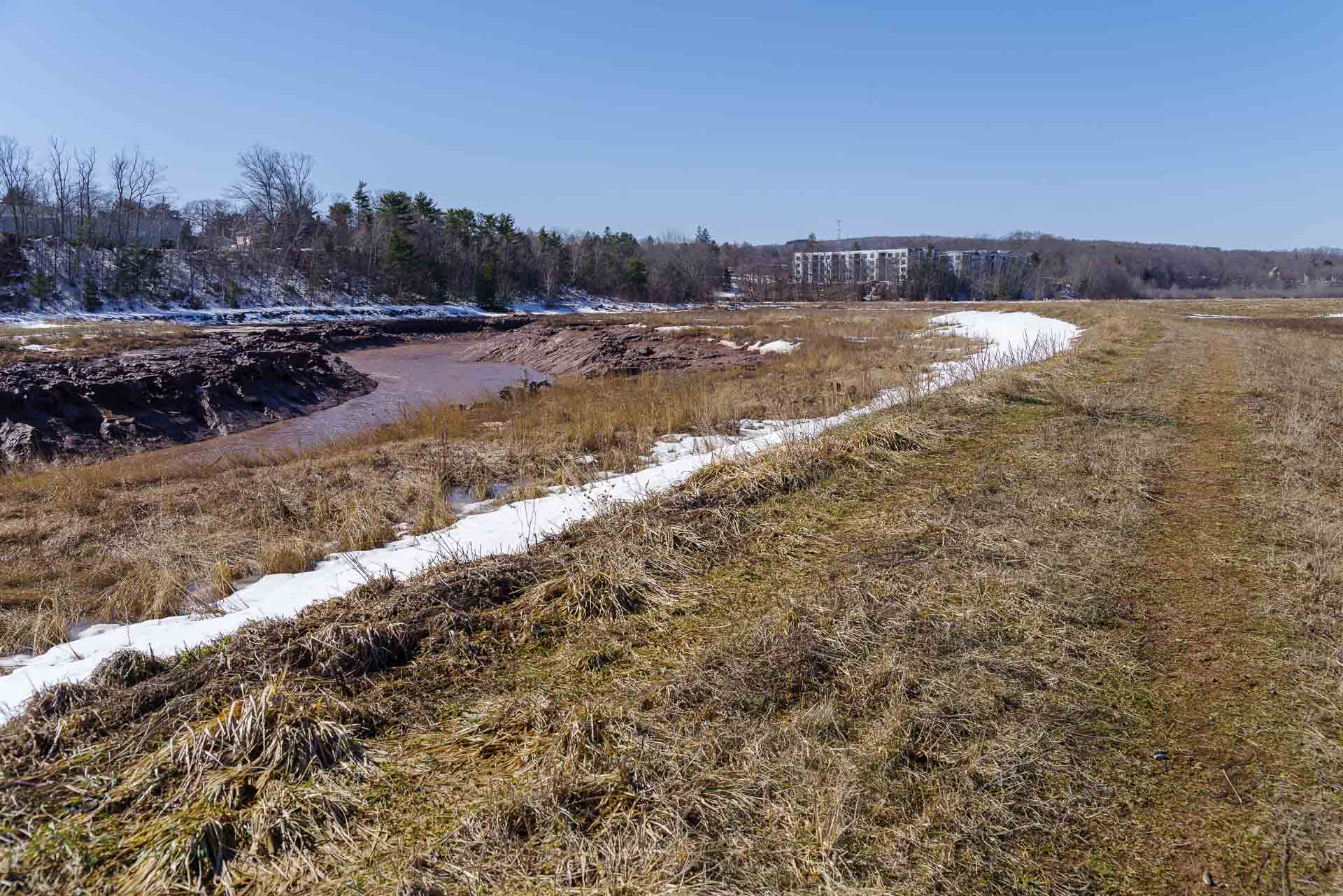 Cornwallis River (Jijuktu’kwejk)Cornwallis River Crossing Rd. in New Minus, viewing inland toward Miners Marsh and Kentville along the top of the dyke.